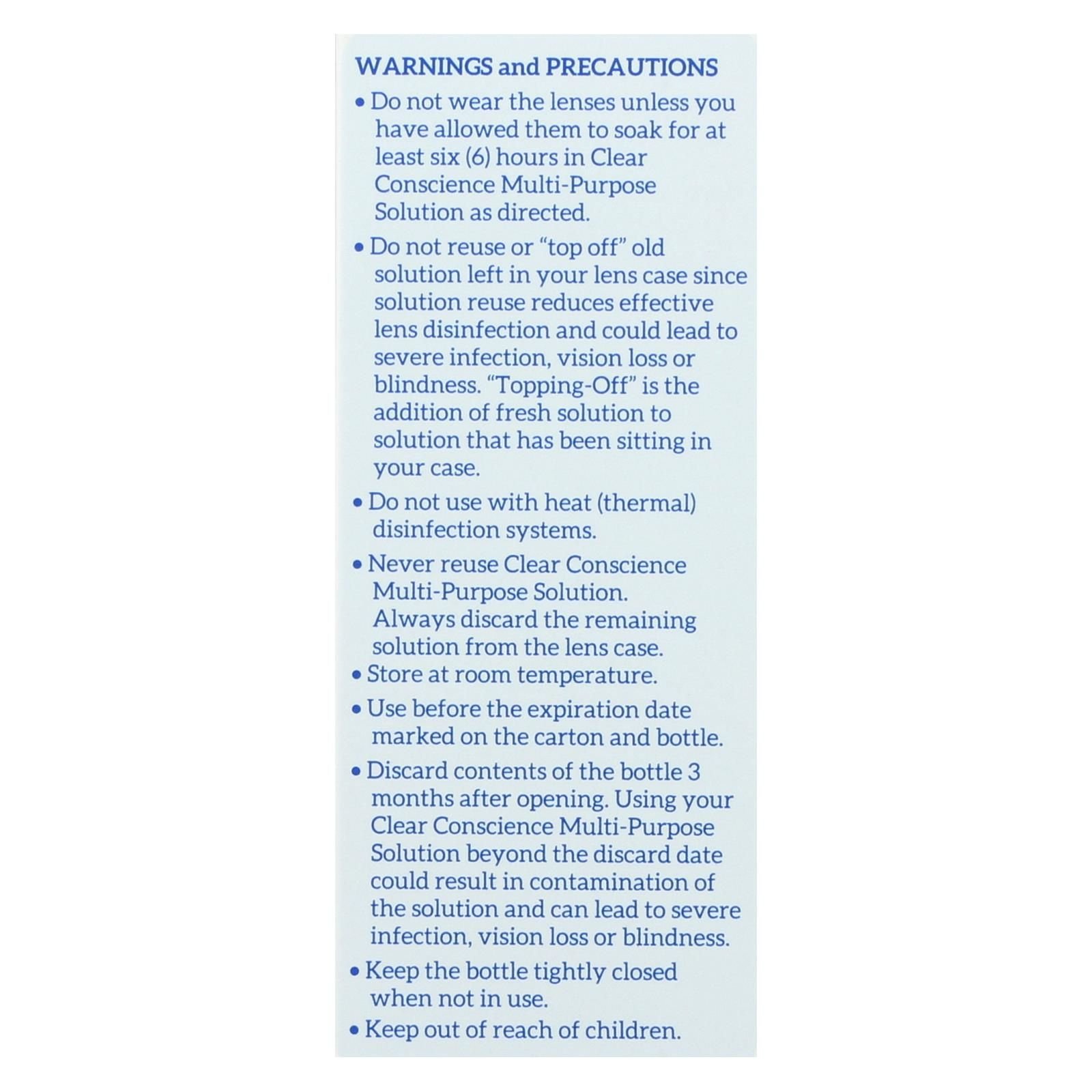 Clear conscience multi-purpose soft contact lens solution is a safe and effective lens care solution for soft, hydrophilic contact lenses.our product is intended only for cleaning, disinfecting, removing protein from, rinsing and storing your soft contact lenses. This isotonic solution is sterilized by filtration, never by irradiation. This bottle contains 3 fl. Oz of solution.